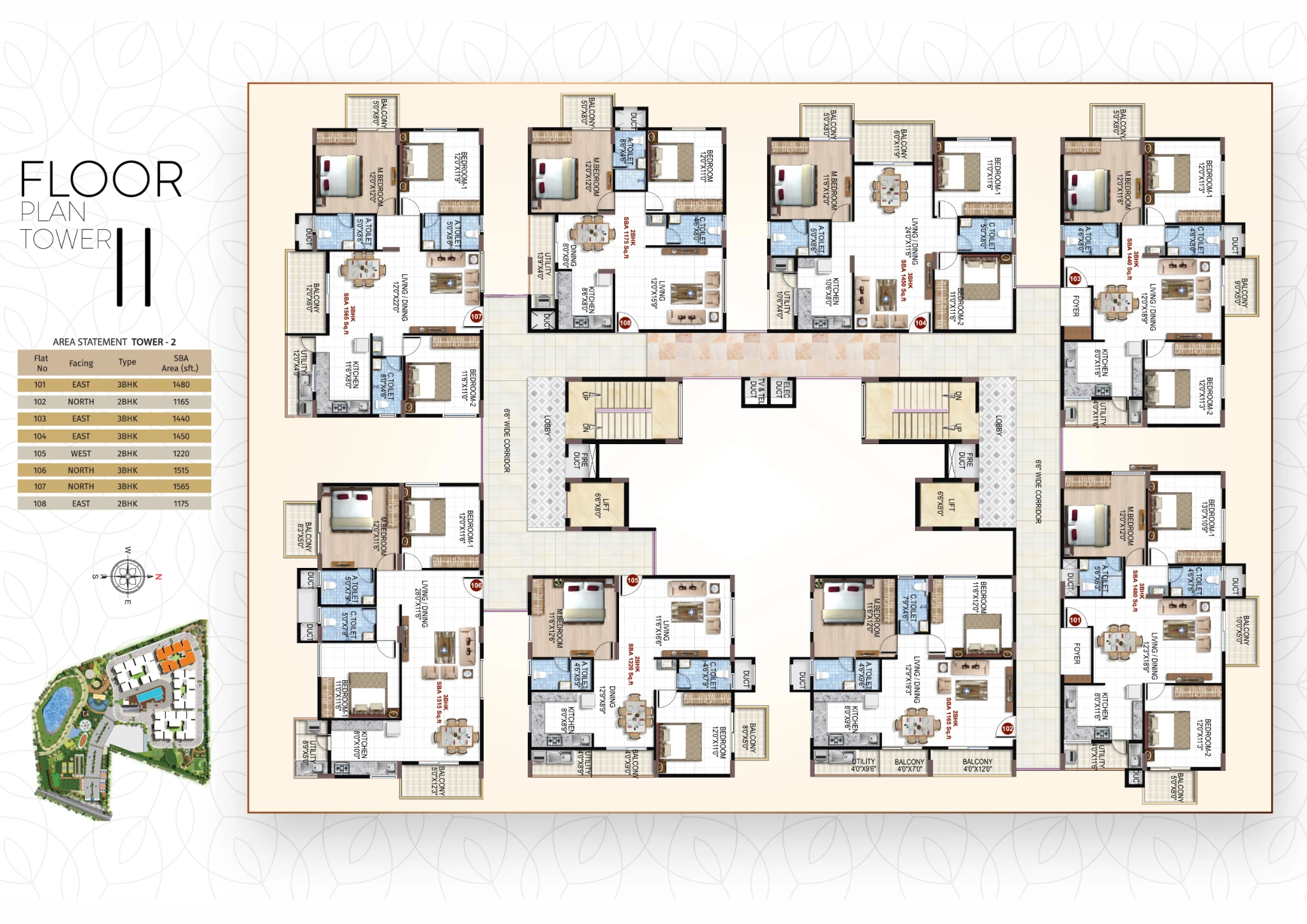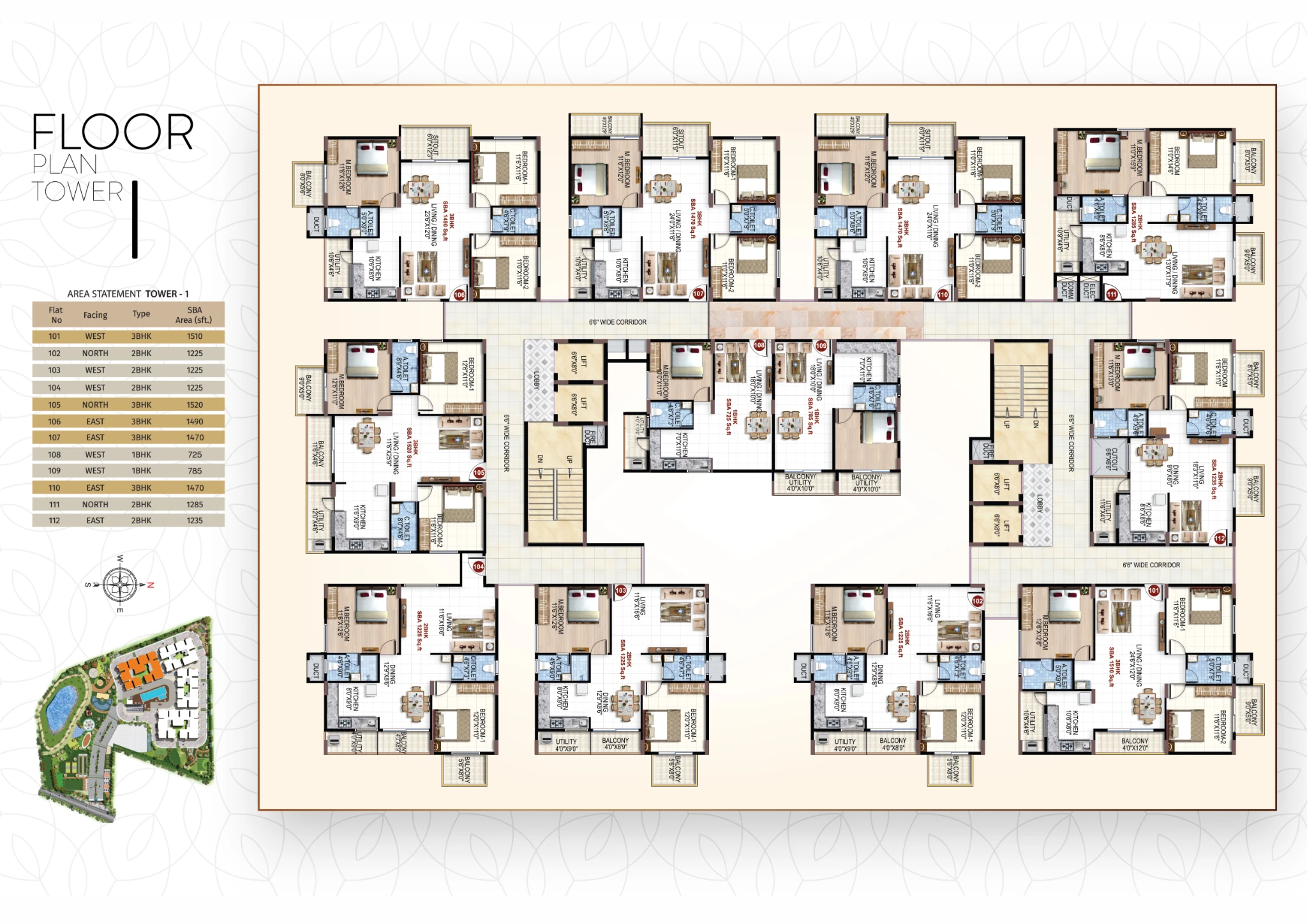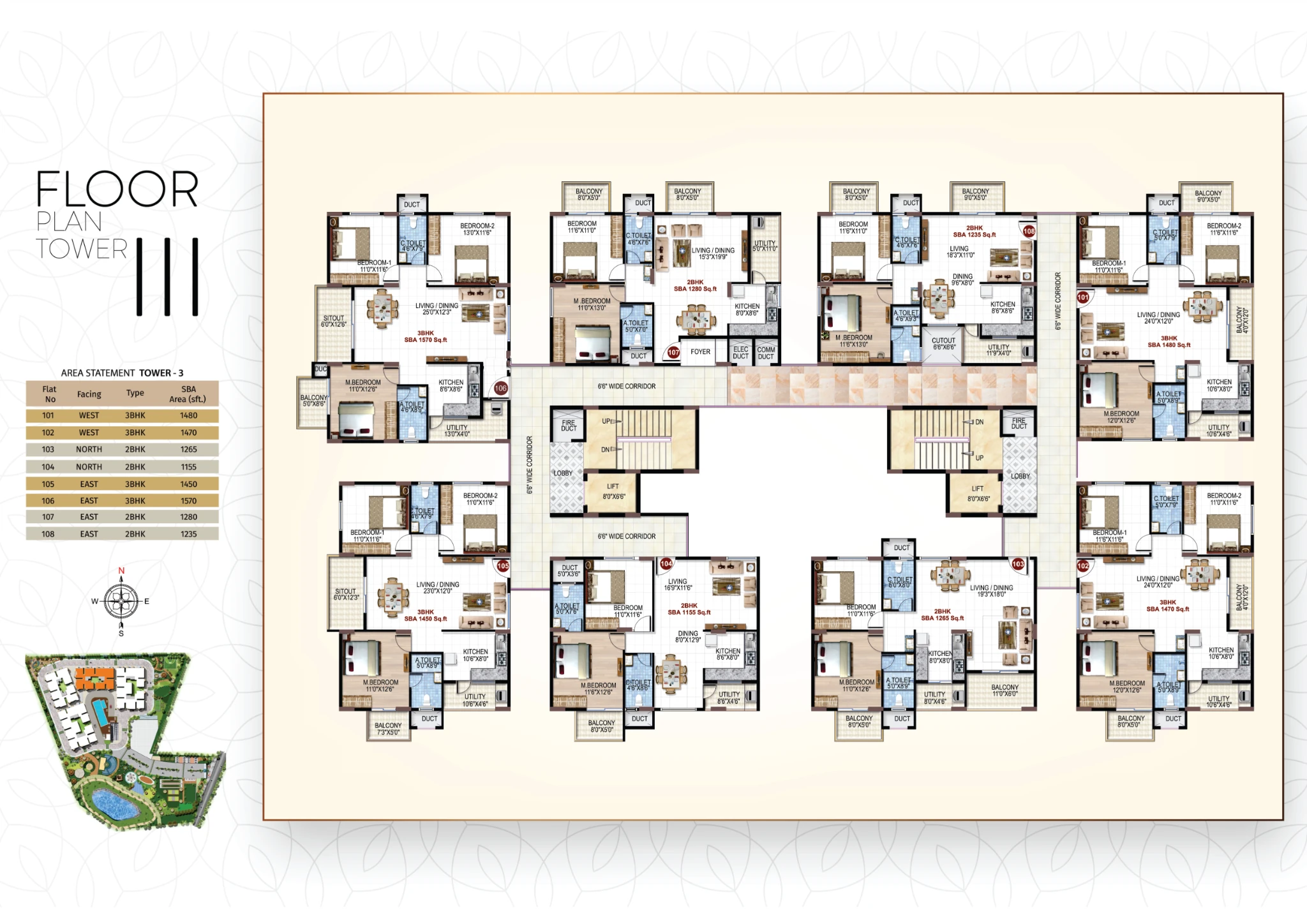 The project offers 1, 2, and 3 BHK apartments, with built-up sizes ranging approximately from 725 sq. ft. to 1,570 sq. ft.
